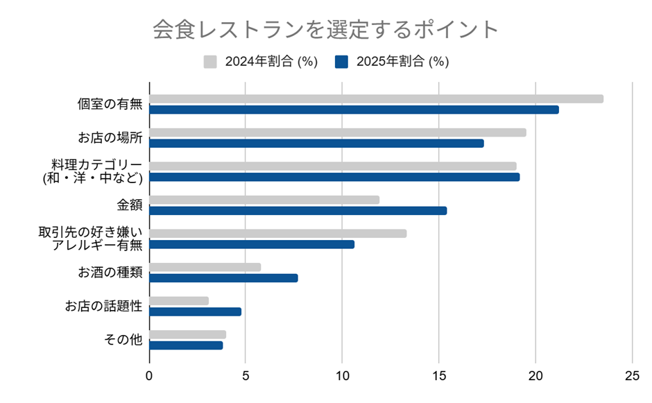 会食の予算に合わせた「金額」も、常に考慮される基本条件として挙げられています。 2024年の回答は11.9%でしたが、2025年の回答は15.4%と3.5%伸びており、重要性が高まる傾向にあります。厳しい予算金額ですと選ぶのも一苦労しますが大切なポイントとなるため、この予算ならここ、など目安となるお店情報をストックしておくと良いでしょう。