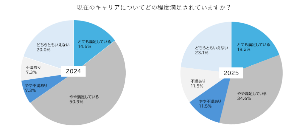 秘書が現在のキャリアに対してどの程度の満足度を感じているのか、2024年と2025年のアンケート結果を比較し、その背景にある要因を探ります。